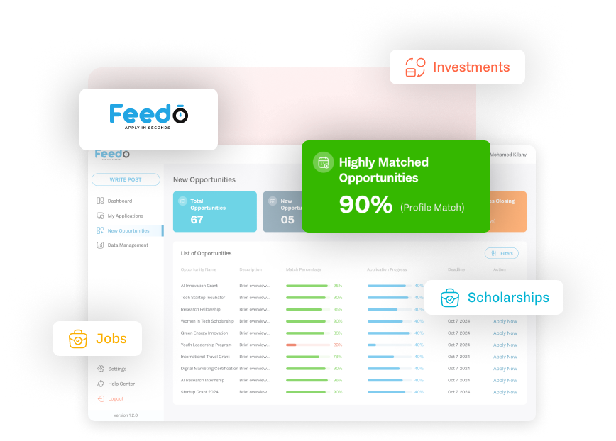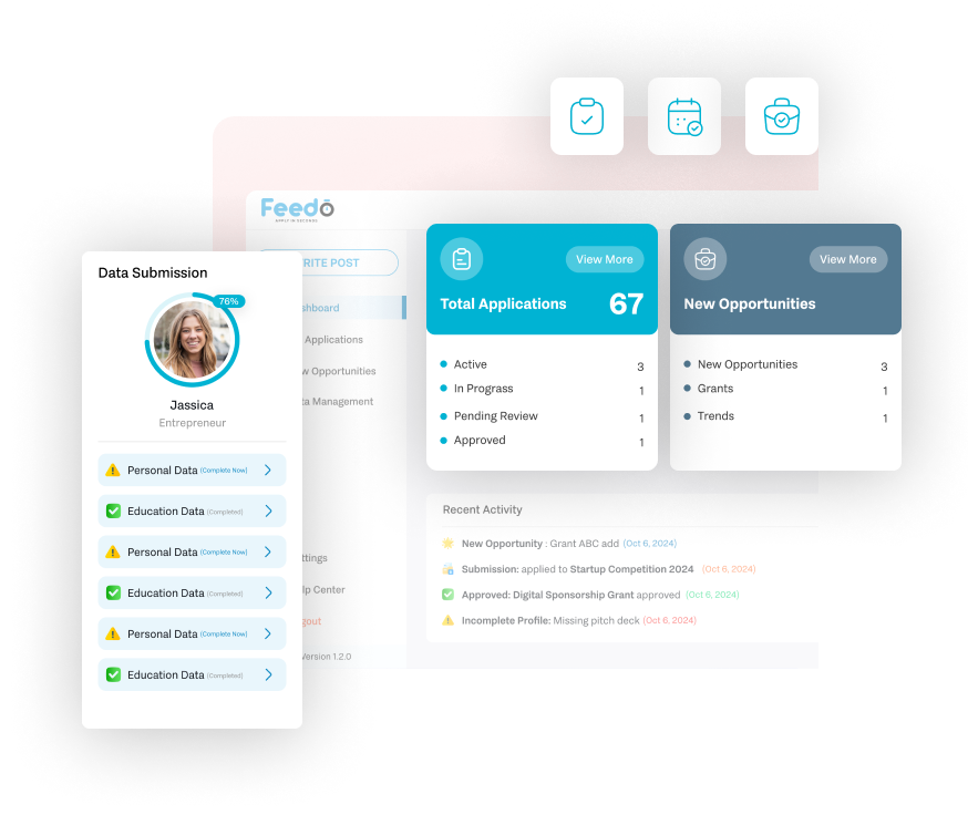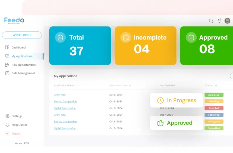 Feedo’s dynamic dashboard gives you a 360° view of your activity, including total applications, highly matched opportunities, and real-time updates. With visual tools like progress bars and submission stats, you can identify what’s pending, approved, or rejected and act on insights immediately to stay ahead.